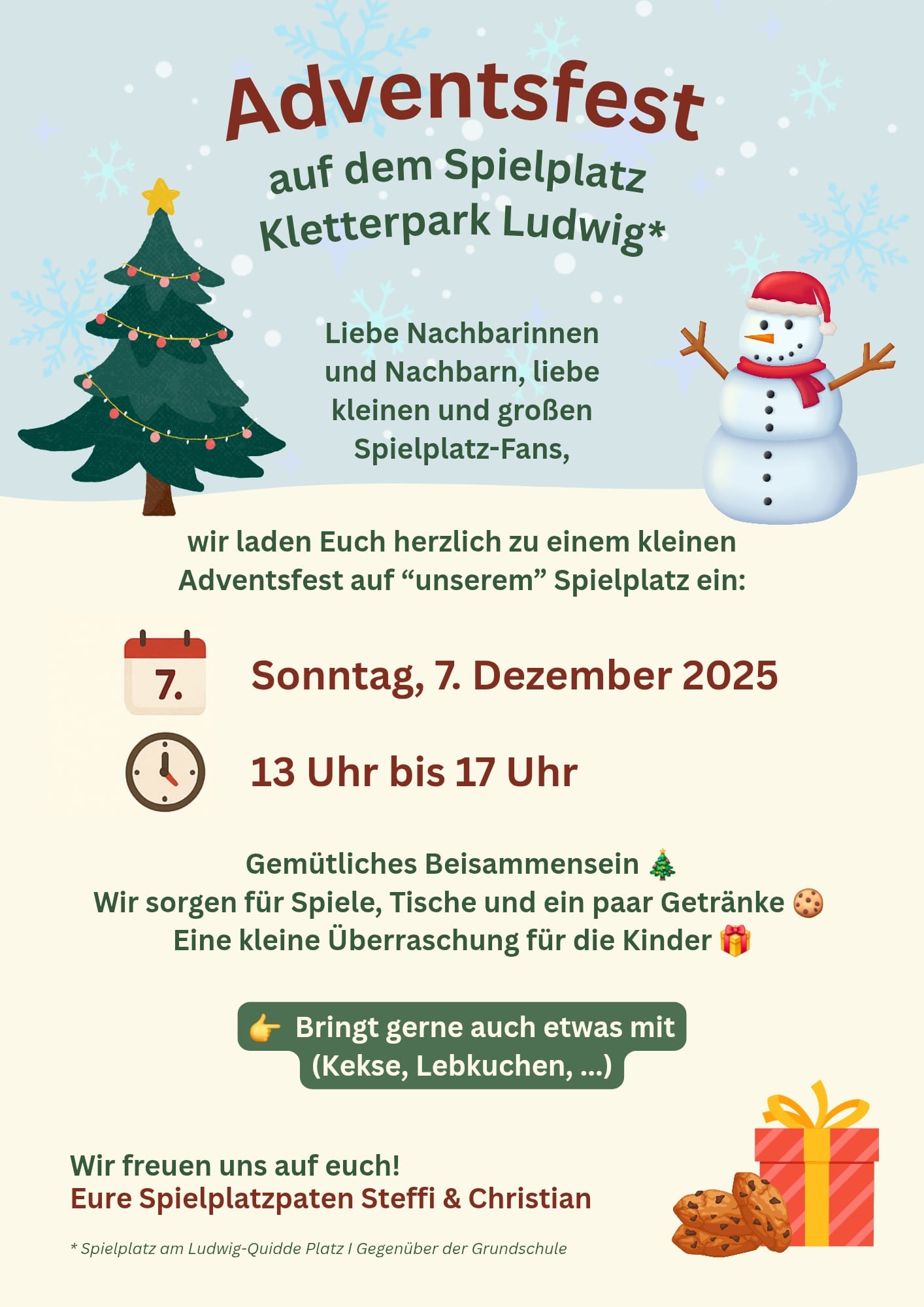 Die Spielplatzpaten Steffi und Christian organisieren am 7. Dezember ab 13 Uhr ein kleines Adventsfest auf dem Spielplatz ‚Kletterpark Ludwig‘ (gegenüber der Grundschule Ludwig-Quidde-Platz). Gemütliches Beisammensein mit Spielen, Getränken und einer kleinen Überraschung für die Kinder. Bringt auch gerne etwas zu Essen mit wie Kekse oder Lebkuchen.