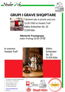 Die Albanische Frauengruppe trifft sich jeden Freitag von 16:30 bis 19:00 Uhr in der Käthe-Schlechter-Straße 25.