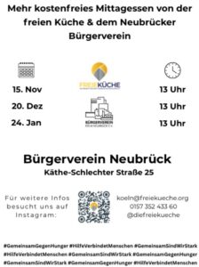 Freie Küche Freie Küche Termin Details Dieser Termin läuft vom 18 Oktober 2025 bis 24 Januar 2026 und findet das nächste Mal am 15. November 2025 13:00 statt. Ort: TiV Treff im Veedel Terminkategorien: BüV Monatlich Kommende Daten: 15. November 2025 13:00 – 14:0020. Dezember 2025 13:00 – 14:0024. Januar 2026 13:00 – 14:00 Kostenfreies Mittagessen von der Freien Küche & dem Bürgerverein Neubrück