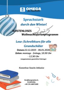 Die Omega Sprachschule bietet ein kostenloses Weihnachtsferienprogram an. Vom 22. Dezember bis 6. Januar (ausgenommen gesetzliche Feiertage) Montag bis Freitag von 10:30 bis 12:30 Uhr. Der Kurs ist speziell für Grundschüler, komplett kostenfrei (unabhängig vom Leistungsbezug), bietet Förderung in Kleingruppen zur Stärkung von Leseflüssigkeit, Rechtschreibung und Grundkompetenzen.
