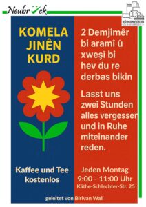 Kurdische Auszeit Kurdische Auszeit Termin Details Dieser Termin läuft vom 24 November 2025 bis 28 Dezember 2026 und findet das nächste Mal am 29. Dezember 2025 9:00 statt. Ort: Bürgerverein Köln-Neubrück e.V. Terminkategorien: BüV Regelmäßig Kommende Daten: 22. Dezember 2025 9:00 – 11:0029. Dezember 2025 9:00 – 11:005. Januar 2026 9:00 – 11:0012. Januar 2026 9:00 – 11:0019. Januar 2026 9:00 – 11:0026. Januar 2026 9:00 – 11:002. Februar 2026 9:00 – 11:009. Februar 2026 9:00 – 11:0016. Februar 2026 9:00 – 11:0023. Februar 2026 9:00 – 11:002. März 2026 9:00 – 11:009. März 2026 9:00 – 11:0016. März 2026 9:00 – 11:0023. März 2026 9:00 – 11:0030. März 2026 9:00 – 11:006. April 2026 9:00 – 11:0013. April 2026 9:00 – 11:0020. April 2026 9:00 – 11:0027. April 2026 9:00 – 11:004. Mai 2026 9:00 – 11:0011. Mai 2026 9:00 – 11:0018. Mai 2026 9:00 – 11:0025. Mai 2026 9:00 – 11:001. Juni 2026 9:00 – 11:008. Juni 2026 9:00 – 11:0015. Juni 2026 9:00 – 11:0022. Juni 2026 9:00 – 11:0029. Juni 2026 9:00 – 11:006. Juli 2026 9:00 – 11:0013. Juli 2026 9:00 – 11:0020. Juli 2026 9:00 – 11:0027. Juli 2026 9:00 – 11:003. August 2026 9:00 – 11:0010. August 2026 9:00 – 11:0017. August 2026 9:00 – 11:0024. August 2026 9:00 – 11:0031. August 2026 9:00 – 11:007. September 2026 9:00 – 11:0014. September 2026 9:00 – 11:0021. September 2026 9:00 – 11:0028. September 2026 9:00 – 11:005. Oktober 2026 9:00 – 11:0012. Oktober 2026 9:00 – 11:0019. Oktober 2026 9:00 – 11:0026. Oktober 2026 9:00 – 11:002. November 2026 9:00 – 11:009. November 2026 9:00 – 11:0016. November 2026 9:00 – 11:0023. November 2026 9:00 – 11:0030. November 2026 9:00 – 11:007. Dezember 2026 9:00 – 11:0014. Dezember 2026 9:00 – 11:0021. Dezember 2026 9:00 – 11:0028. Dezember 2026 9:00 – 11:00 Lasst uns zwei Stunden alles vergessen und in Ruhe miteinander Reden.