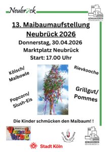 Maibaumaufstellung Maibaumaufstellung Termin Details Datum: 30. April 2026 17:00 – 19:00 Ort: Marktplatz Terminkategorien: Woanders (besonders) Am 30. April wird ab 17 Uhr wieder der Maibaum auf dem Marktplatz aufgestellt. Die Kinder schmücken den Baum, es gibt Reivkooche, Grillgut, Pommes, Popcorn, Slush-Eis, Kölsch und Maibowle.