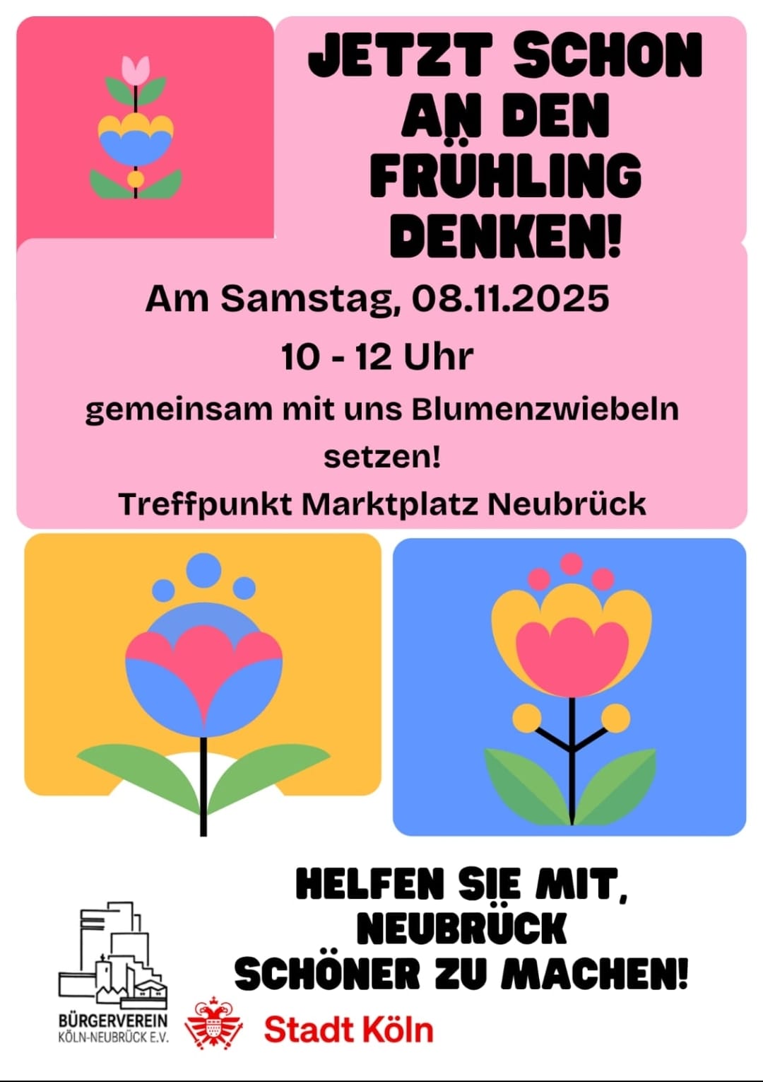 Blumenzwiebeln setzen in Neubrück: Möchten Sie sich auch an den ersten Frühlingsboten erfreuen und kennen eine Stelle dafür? Kommen Sie am 08.11.25 zwischen 10 und 12 Uhr zum Marktplatz Neubrück. Wir nehmen auch gerne Stauden aus Ihrem Garten oder Balkon.
