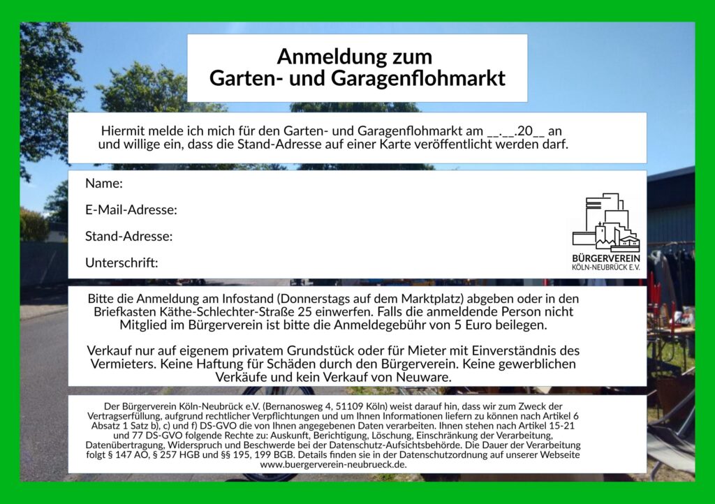 Zur Anmeldung das Formular unten ausdrucken, ausfüllen und am Infostand (Donnerstags auf dem Marktplatz) abgeben oder in den Briefkasten Käthe-Schlechter-Straße 25 einwerfen. Falls die anmeldende Person nicht Mitglied im Bürgerverein ist bitte die Anmeldegebühr von 5 Euro beilegen.